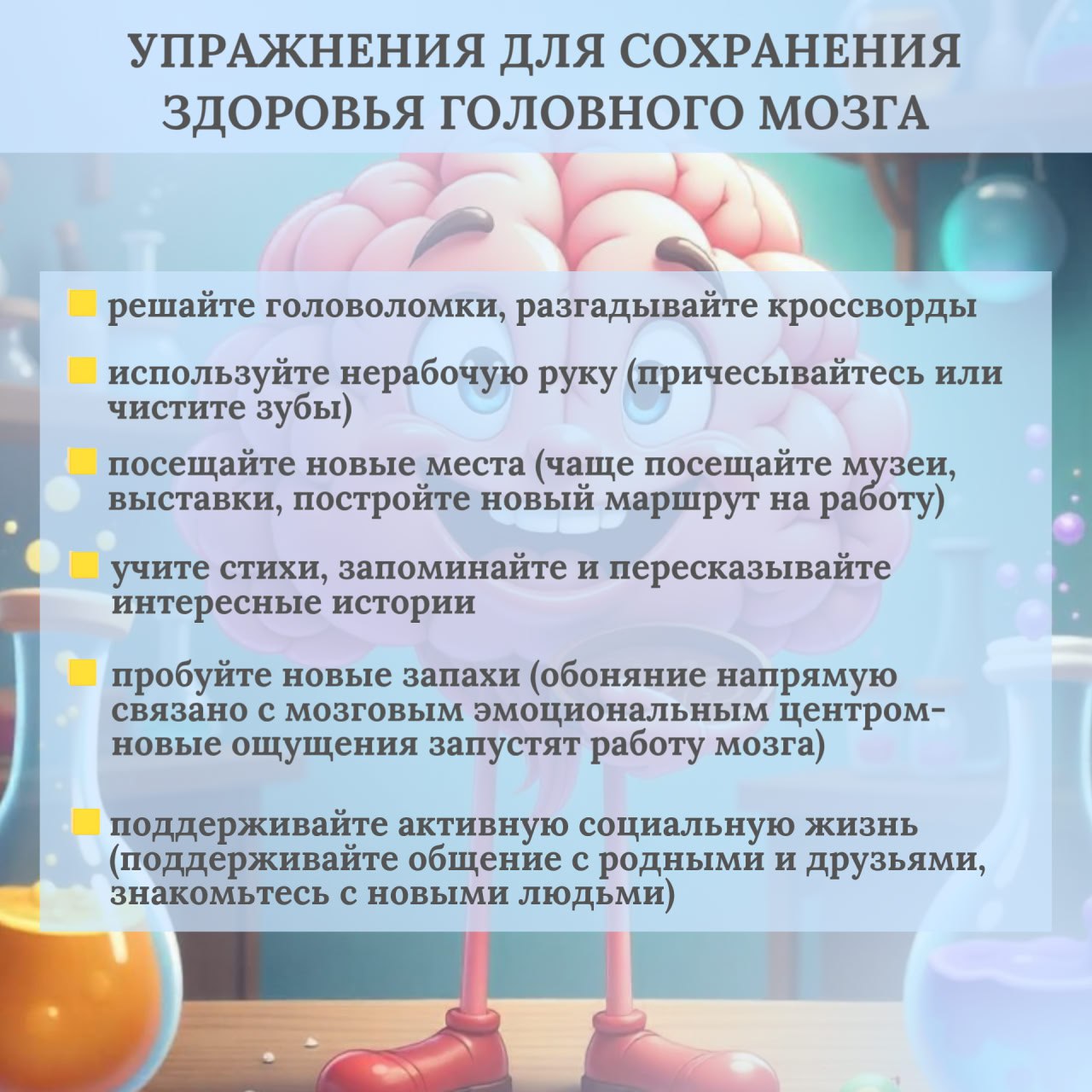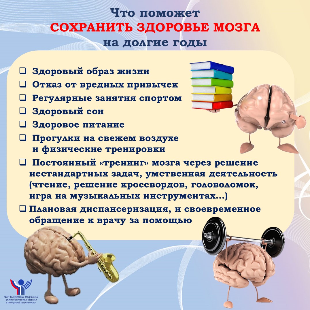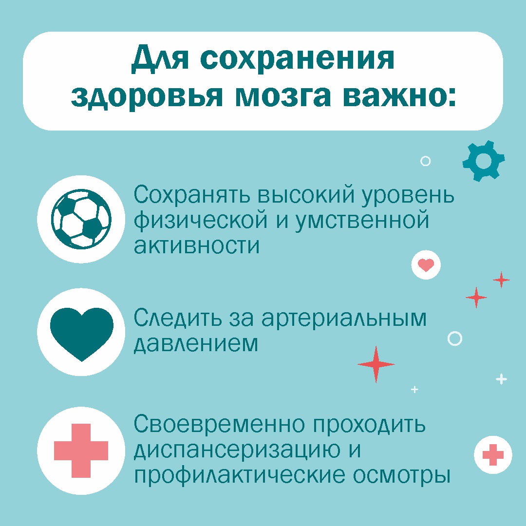 Основные факторы, способствующие сохранению здоровья мозга — здоровый образ жизни, включающий правильное питание, регулярные физические нагрузки и полноценный отдых, поддержание активной интеллектуальной и физической деятельности, контроль над артериальным давлением, холестерином, глюкозой крови и состоянием сердечно-сосудистой системы. Если замечены признаки умеренного снижения памяти или внимания, необходимо ответственно относиться к своему здоровью, проходить ежегодную диспансеризацию и обращаться к специалистам сразу же при появлении тревожных симптомов.
