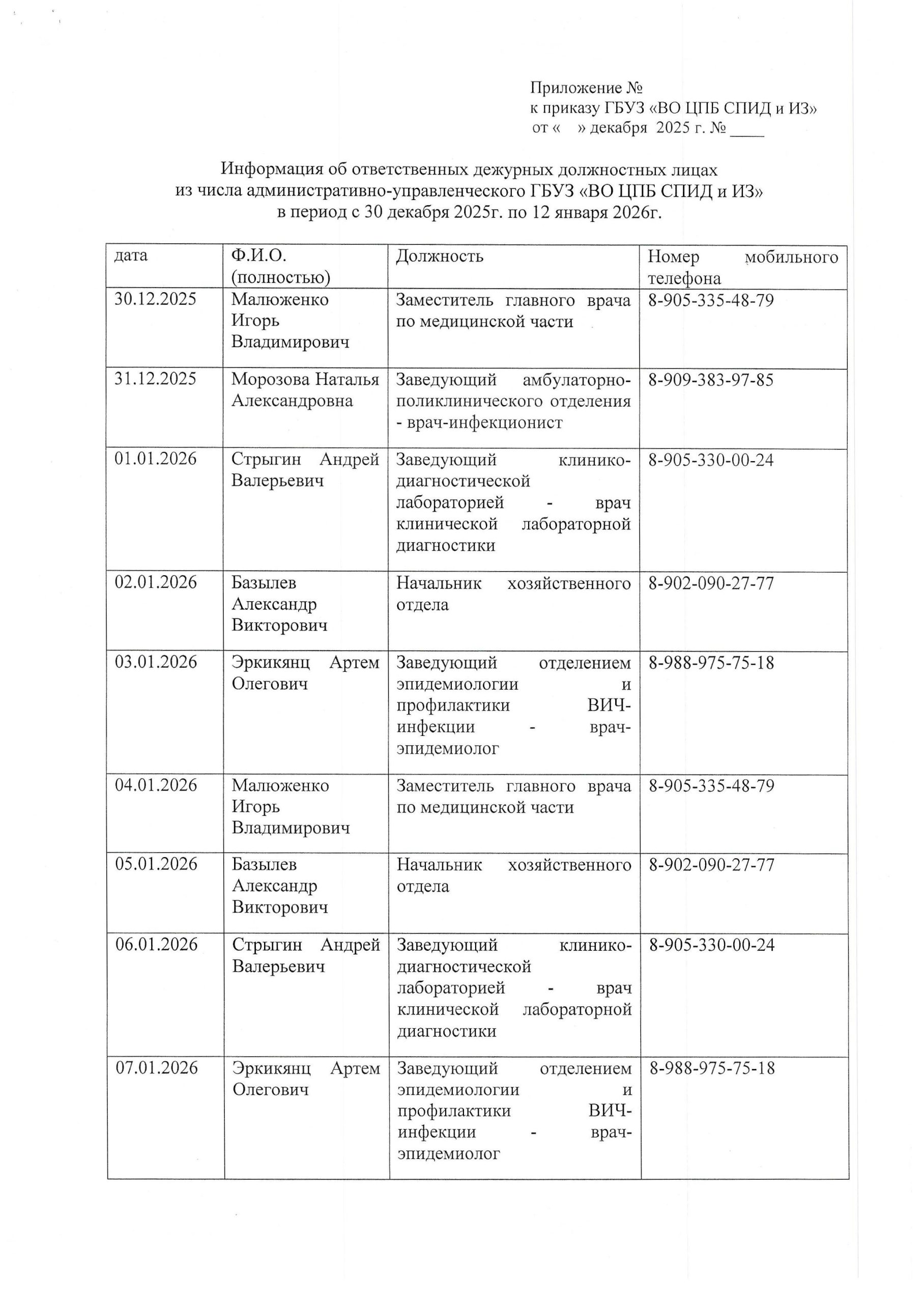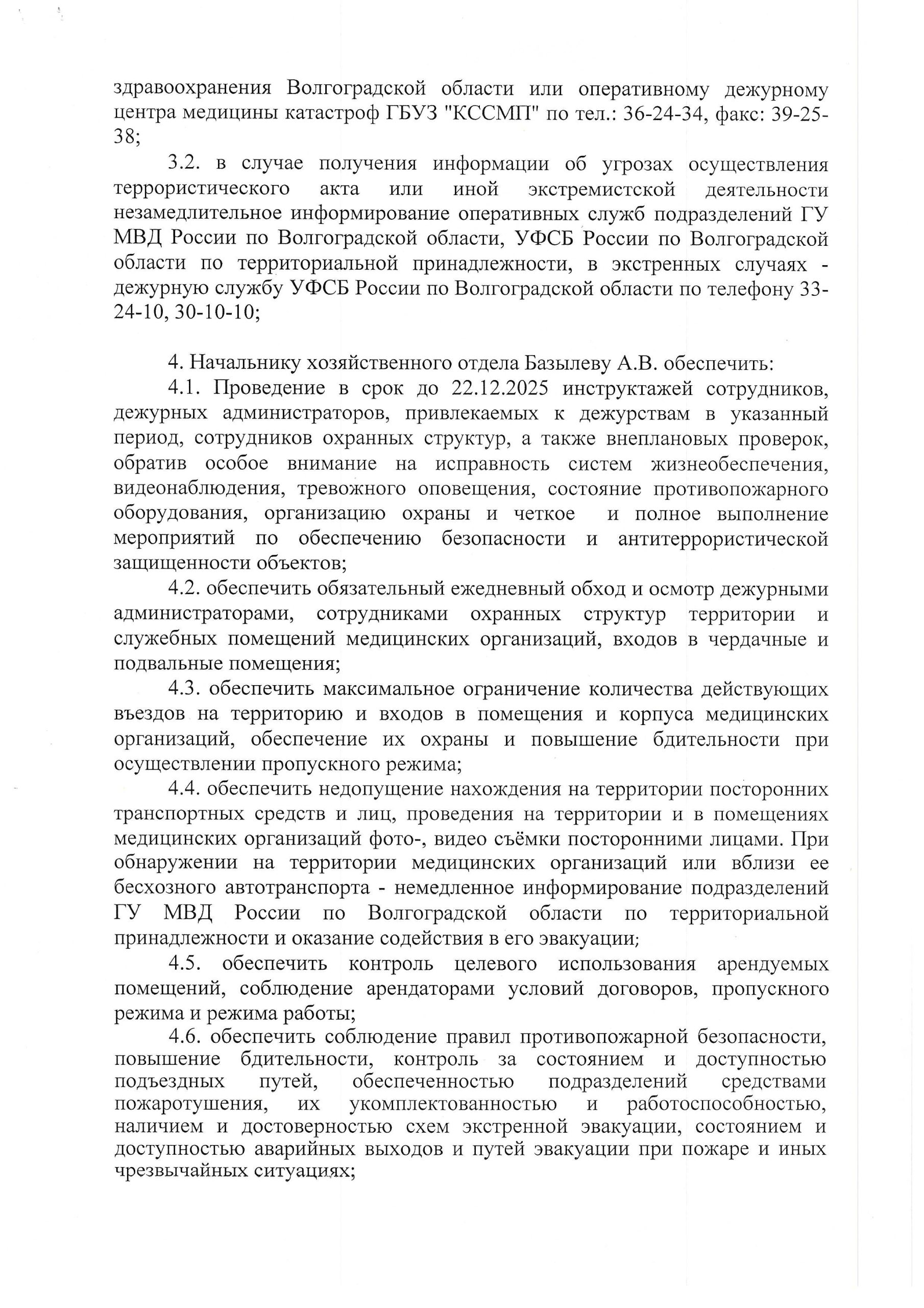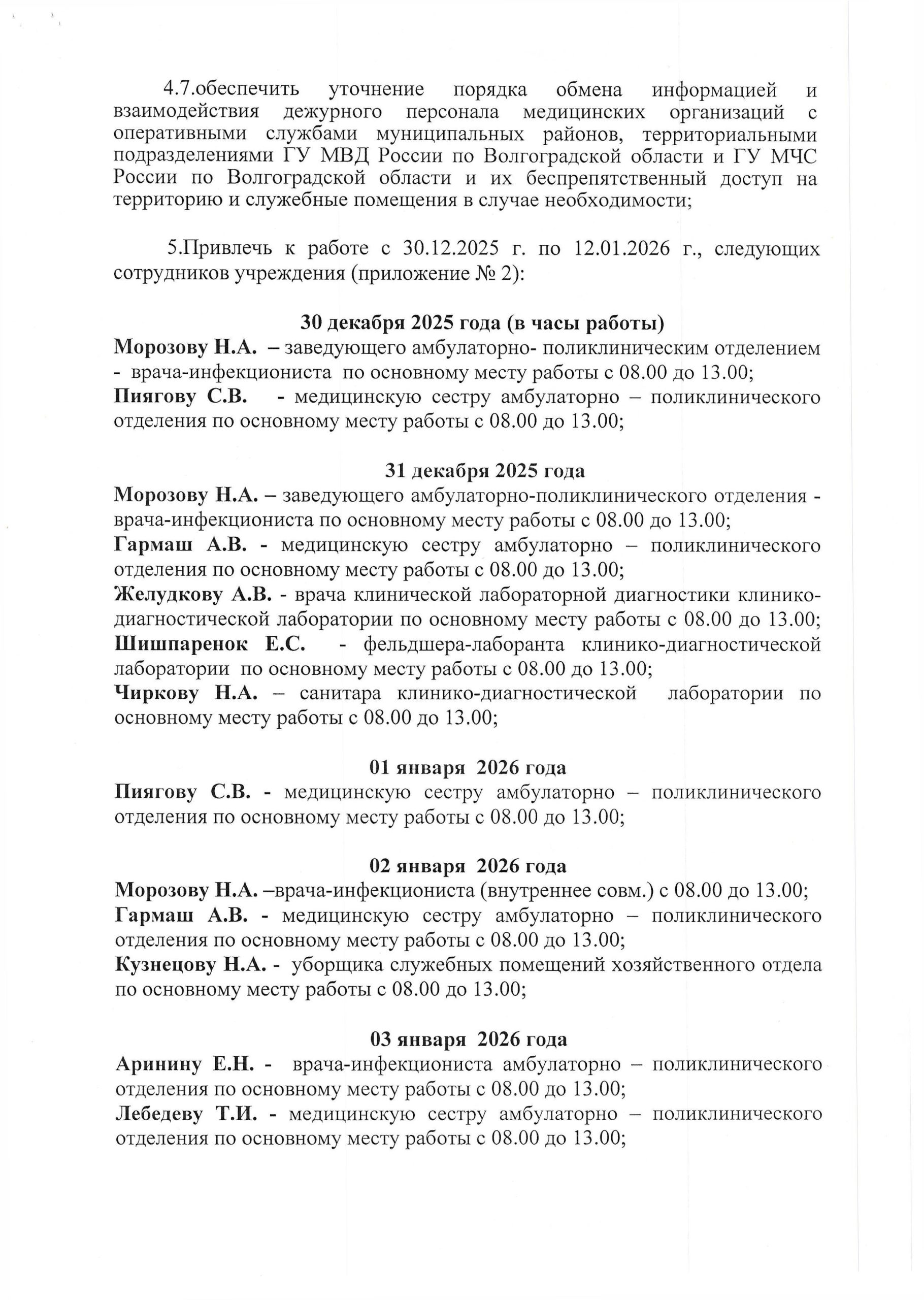 Приказ «О назначении ответственных лиц, мерах по обеспечению безопасности в государственном бюджетном учреждении здравоохранения «Волгоградский областной Центр по профилактике и борьбе со СПИД и инфекционными заболеваниями», Волгоград, и об организации медицинской помощи в период предпраздничных, праздничных и выходных дней с 30 декабря 2025 года по 12 января 2026 года